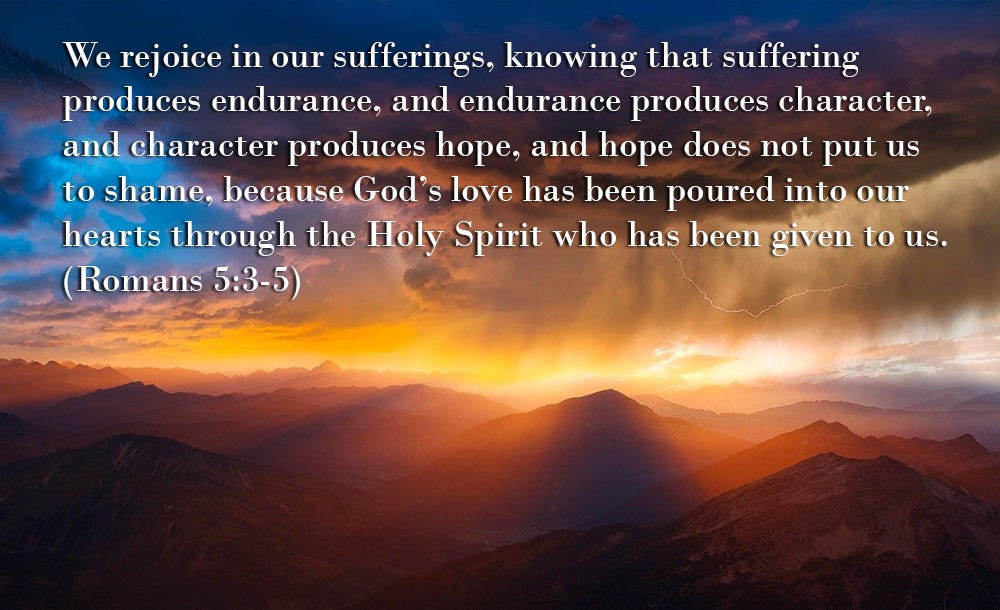 More than that, we rejoice in our sufferings, knowing that suffering produces endurance, and endurance produces character, and character produces hope, and hope does not put us to shame, because God’s love has been poured into our hearts through the Holy Spirit who has been given to us. (Romans 5:3-5)I was in a car accident where I was hit by and sandwiched between two semi-trucks and I am still alive to talk about it. I suffered a shoulder impingement and a bulging disc in my neck. For two years until I could get surgery, I could barely move my left arm or turn my neck to the left. I prayed, and God helped me through it.